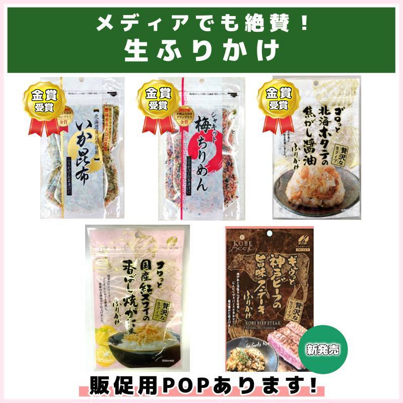 販促用POPあります! 常温商品ですので、お土産としても最適! 「生ふりかけ」とは、素材そのものをしっとりと組み合わせた、風味も食感も楽しめるちょっと贅沢なふりかけです。