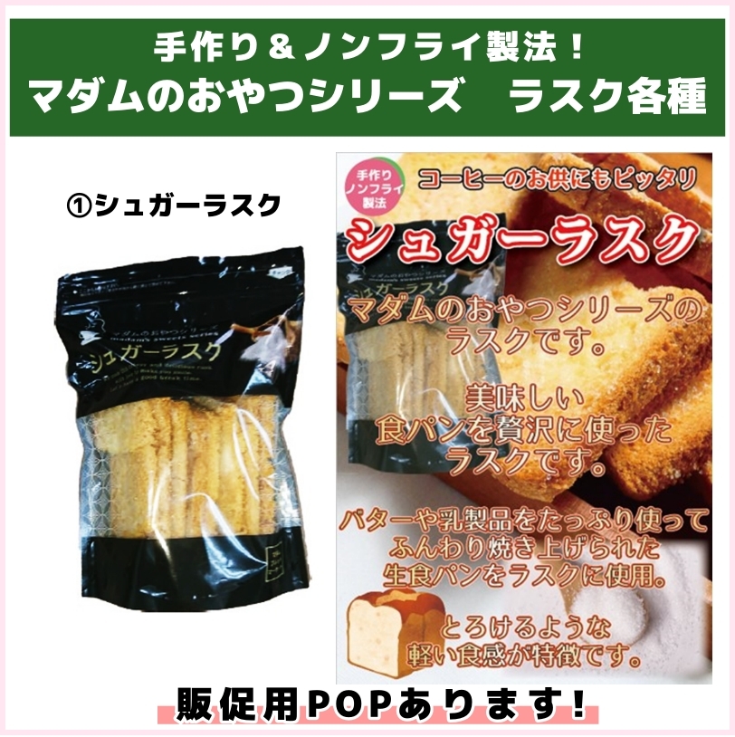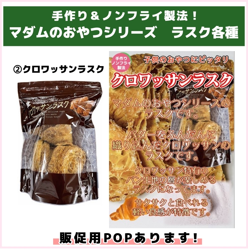 ① マダムのおやつシリーズ シュガーラスク JAN:4589686730129 ② マダムのおやつシリーズ クロワッサンラスク JAN:4589686730174 |