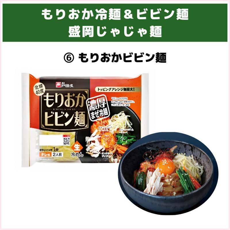 ① もりおか冷麺 2食 JAN:4975007827508 ② もりおか冷麺 梅 2食 JAN:4975007827201 ③ もりおか冷麺 鶏白湯 2食 JAN:4975007827218 ④ もりおか冷麺 ゴマ味噌 2食 JAN:4975007827287 ⑤ 盛岡じゃじゃ麺 2食 JAN:4975007827515 ⑥ もりおかビビン麺 2食 JAN:4975007827195 |