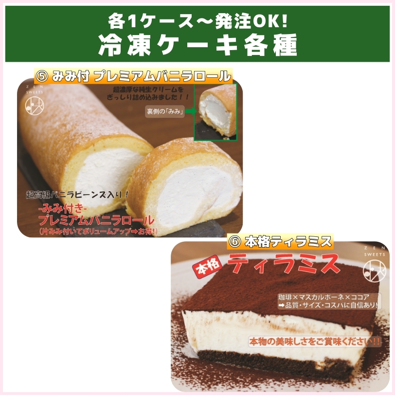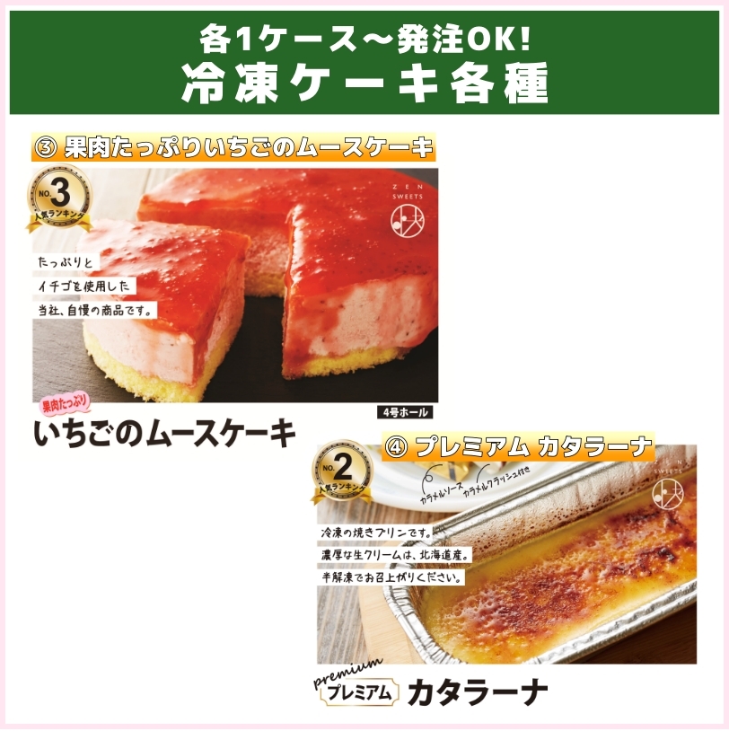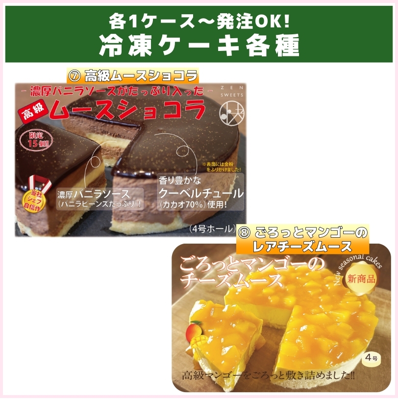 ①冷凍 特濃レアチーズケーキ JAN:4595057298013 ②冷凍 不揃いガトーショコラ JAN:4595057298020 ③冷凍 果肉たっぷりいちごのムースケーキ JAN:4595057298051 ④冷凍 プレミアムカタラーナ JAN:4595057298044 ⑤冷凍 みみ付 プレミアムバニラロール JAN:4595057298082 ⑥冷凍 本格ティラミス JAN:4595057298037 ⑦冷凍 高級ムースショコラ JAN:4595057298105 ⑧ごろっとマンゴーのレアチーズムース JAN:4595057298068 ⑨冷凍 しまんと地栗モンブラン JAN:4595057298112 |